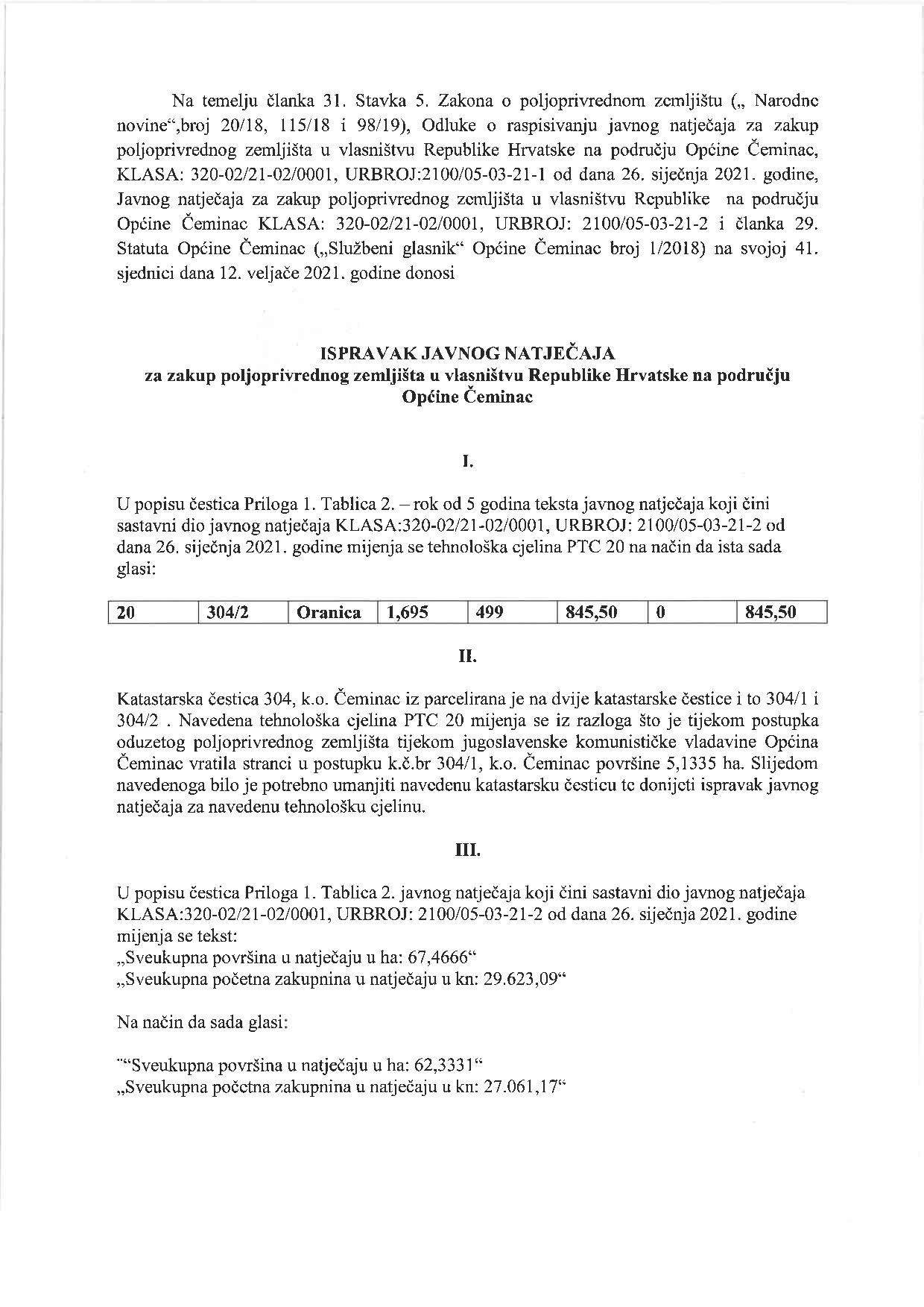 Na temelju članka 31. stavka 5. Zakona o poljoprivrednom zemljištu ("Narodne novine", broj 20/18, 115/18 i 98/19) i Odluke o raspisivanju javnog natječaja za zakup poljoprivrednog zemljišta u vlasništvu Republike Hrvatske na području Općine Čeminac, KLASA: 320-02/21-02/0001, URBROJ: 2100/05-03-21-01 od 26. siječnja 2021. godine., Općinsko vijeće Općine Čeminac, objavljuje